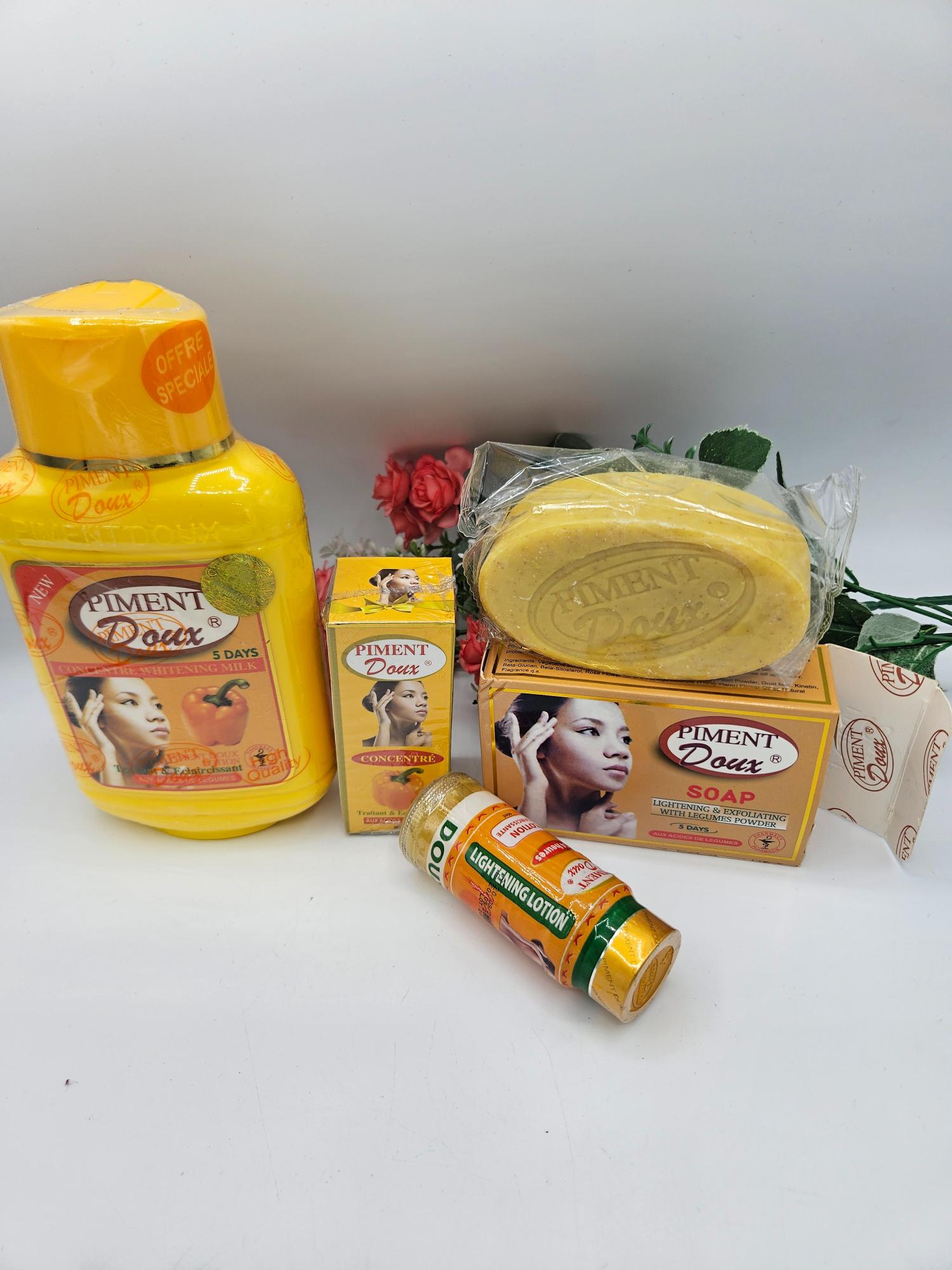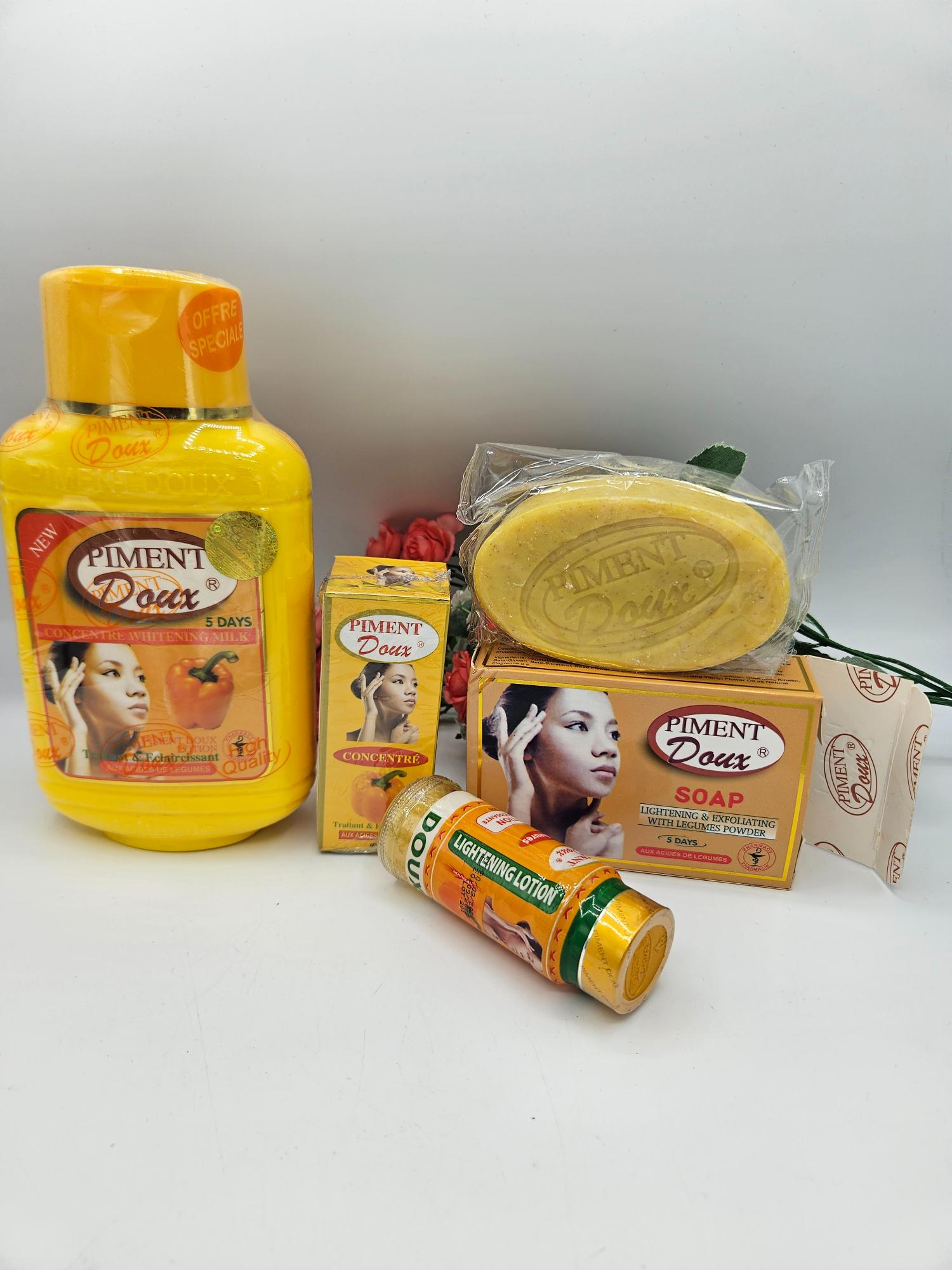 - Lotion Corps Piment Doux : Formule fluide et pénétrante, conçue pour prolonger l’action éclaircissante entre les applications de lait.