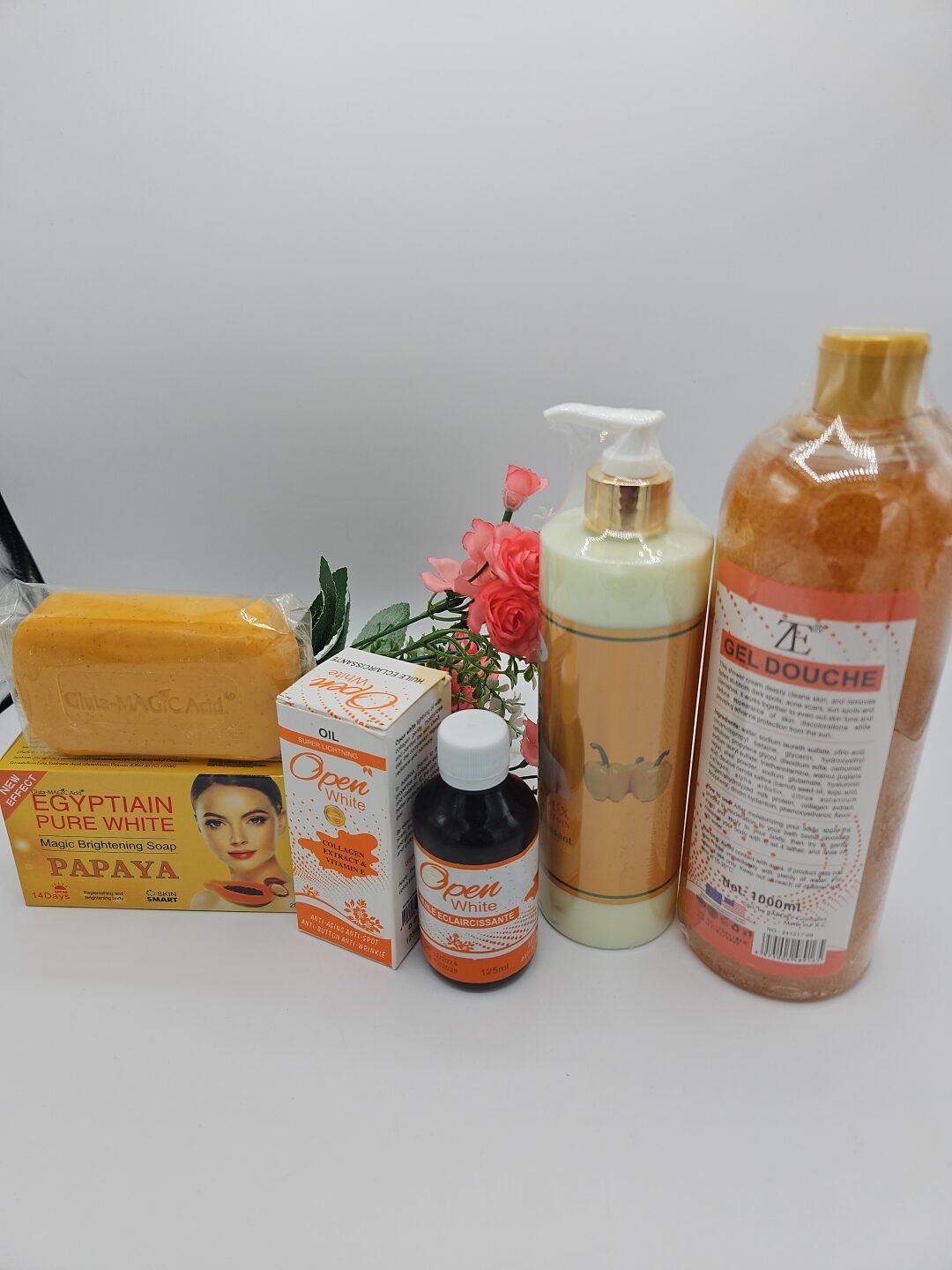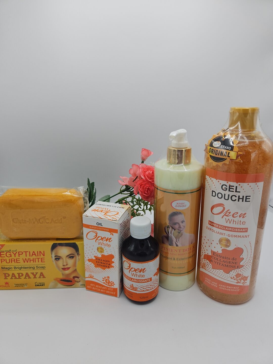 La Gamme corporelle Open White Piment Doux & Papaya est le coffret idéal pour nourrir, hydrater et illuminer votre peau en douceur. Dès la première utilisation, vous ressentirez une peau incroyablement douce grâce au lait corporel Piment Doux 500ml enrichi en beurre de karité, offrant une hydratation profonde et durable. Le gel douche 1 litre nettoie délicatement sans agresser la peau, tandis que l’huile corporelle 125ml apporte une nutrition intense et laisse la peau souple et satinée. Le savon Purec Egyptian Gold Papaya 250g, quant à lui, complète ce rituel en laissant votre peau éclatante et délicatement parfumée.