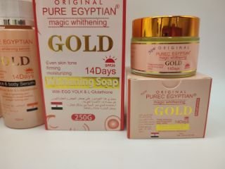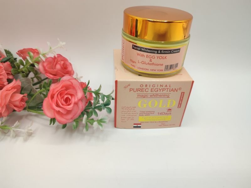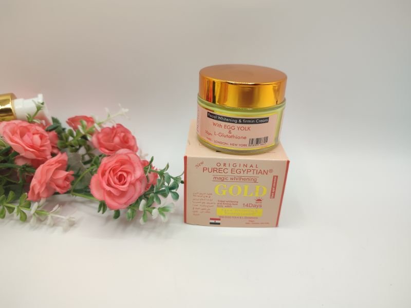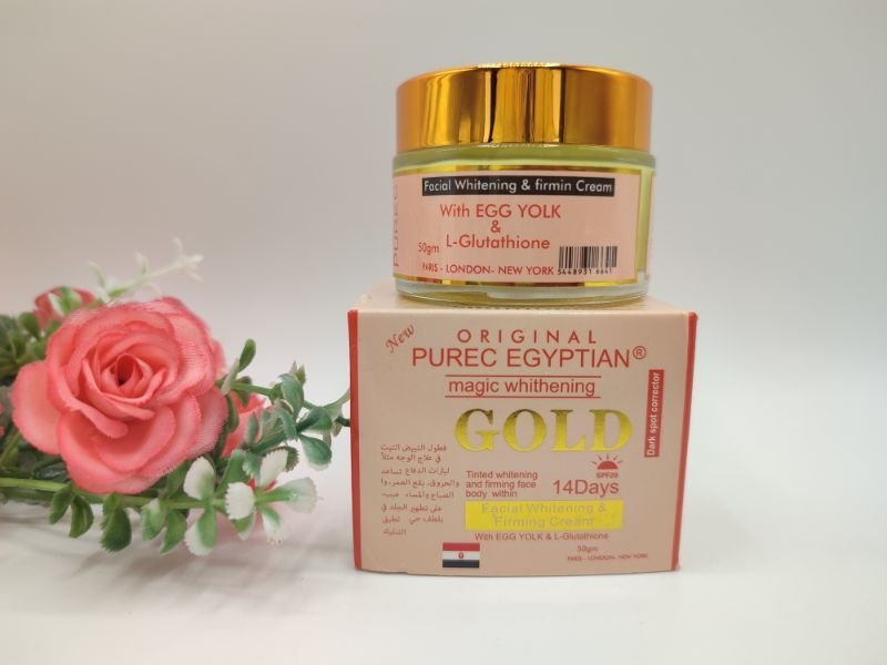 La crème éclaircissante Magic Whitening Gold Pure Egyptian constitue une solution efficace pour le traitement des imperfections cutanées, des brûlures, des taches liées à l’âge, ainsi que pour la prévention des boutons, grâce à la combinaison de jaune d’œuf et de L-glutathion.